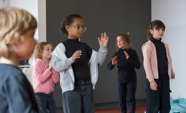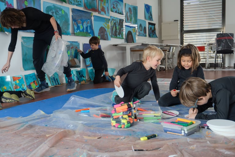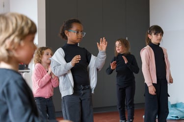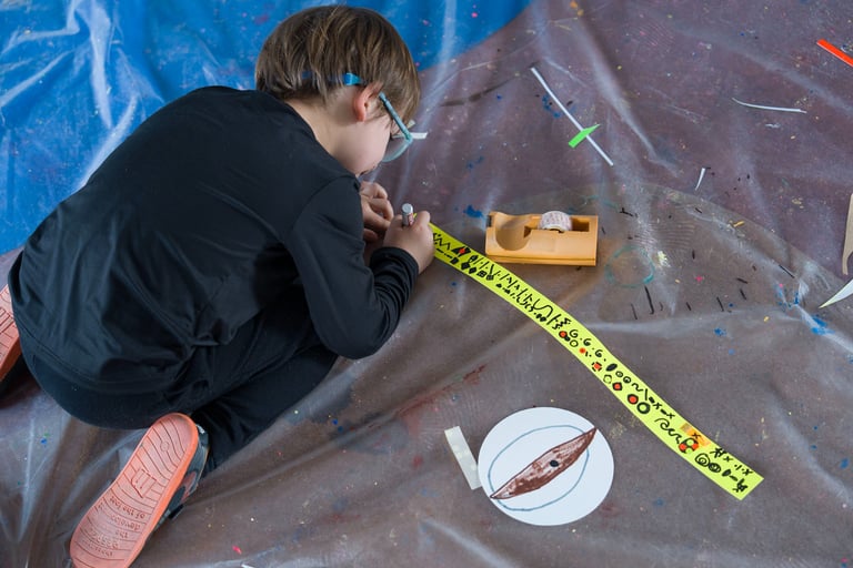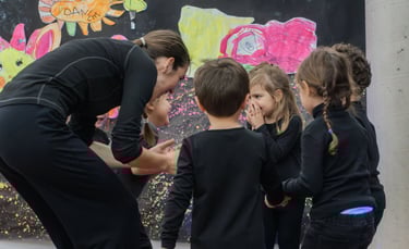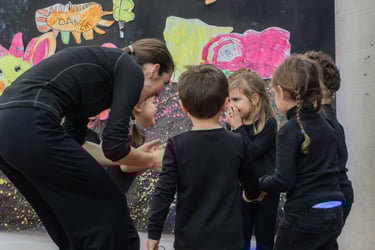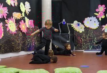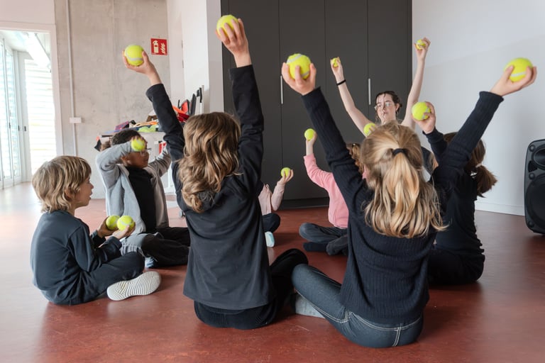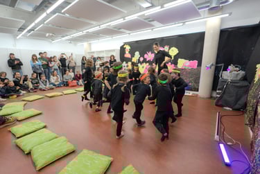 Dibuixem el fons del llac i pesquem a ritme de la música. Saltem per sobre els bolets, els busquem en la foscor com entre la boirina. Toquem instruments que fan dringadissa com el pol·len del riure i ballem la dansa de les flors...