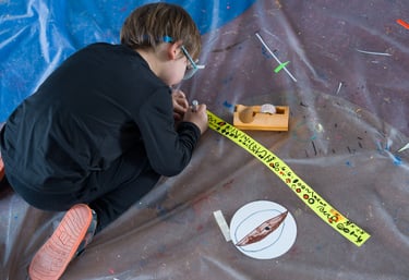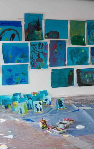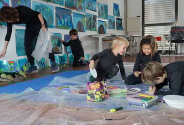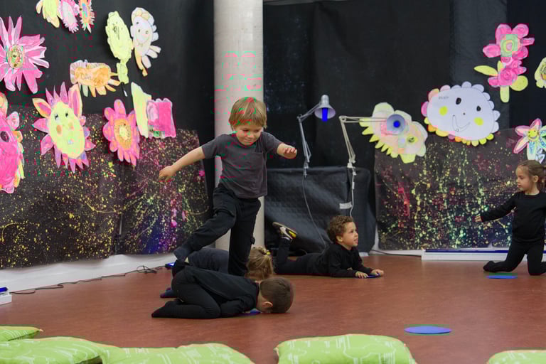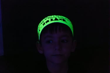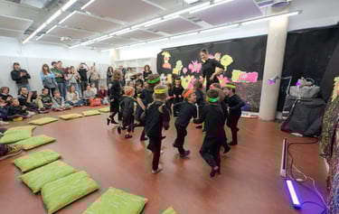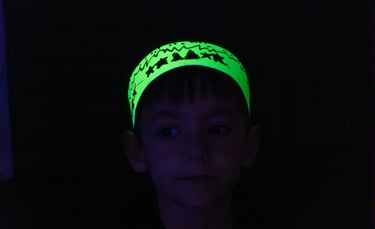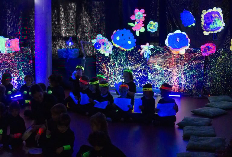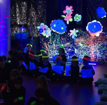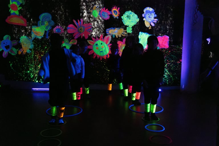 I l'últim dia apaguem les llums i encenem la llum negra: tot el que hem creat, el material amb què ballem i també els instruments brillen en la foscor!